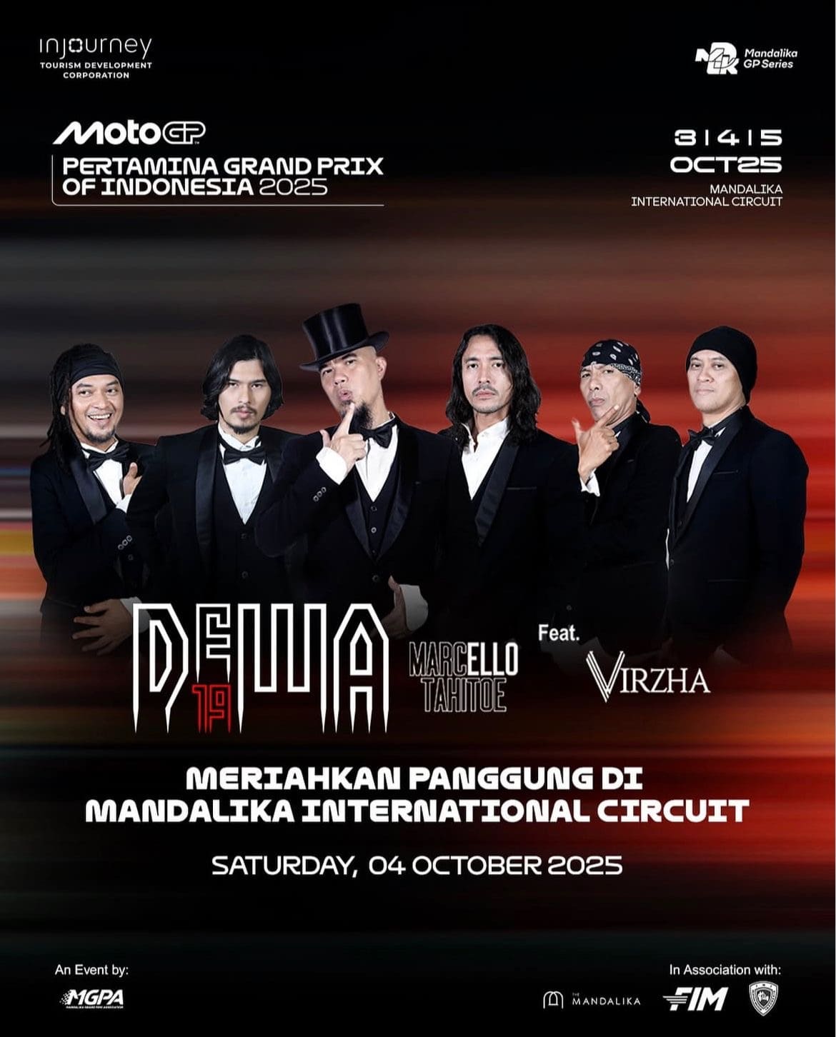 Dewa 19 dijadwalkan naik panggung pada Sabtu malam, 4 Oktober 2025, untuk menghibur ribuan penonton dan fans MotoGP yang hadir.