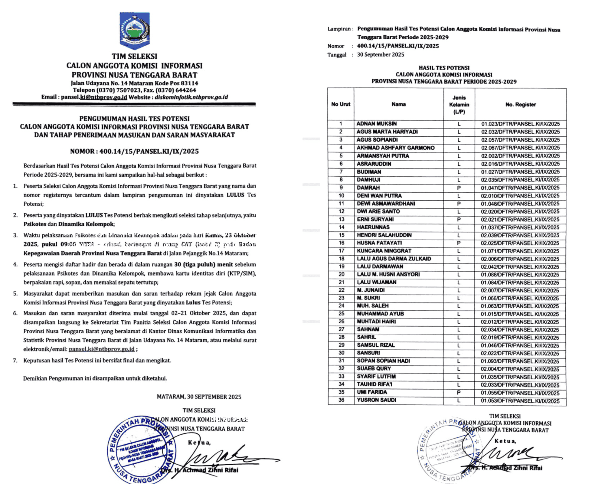 Pojok NTB – Panitia Seleksi Calon Anggota Komisi Informasi Provinsi Nusa Tenggara Barat (NTB) periode 2025-2029 resmi mengumumkan hasil Tes Potensi. Sebanyak 36 peserta dinyatakan lulus dan berhak mengikuti tahapan seleksi berikutnya.