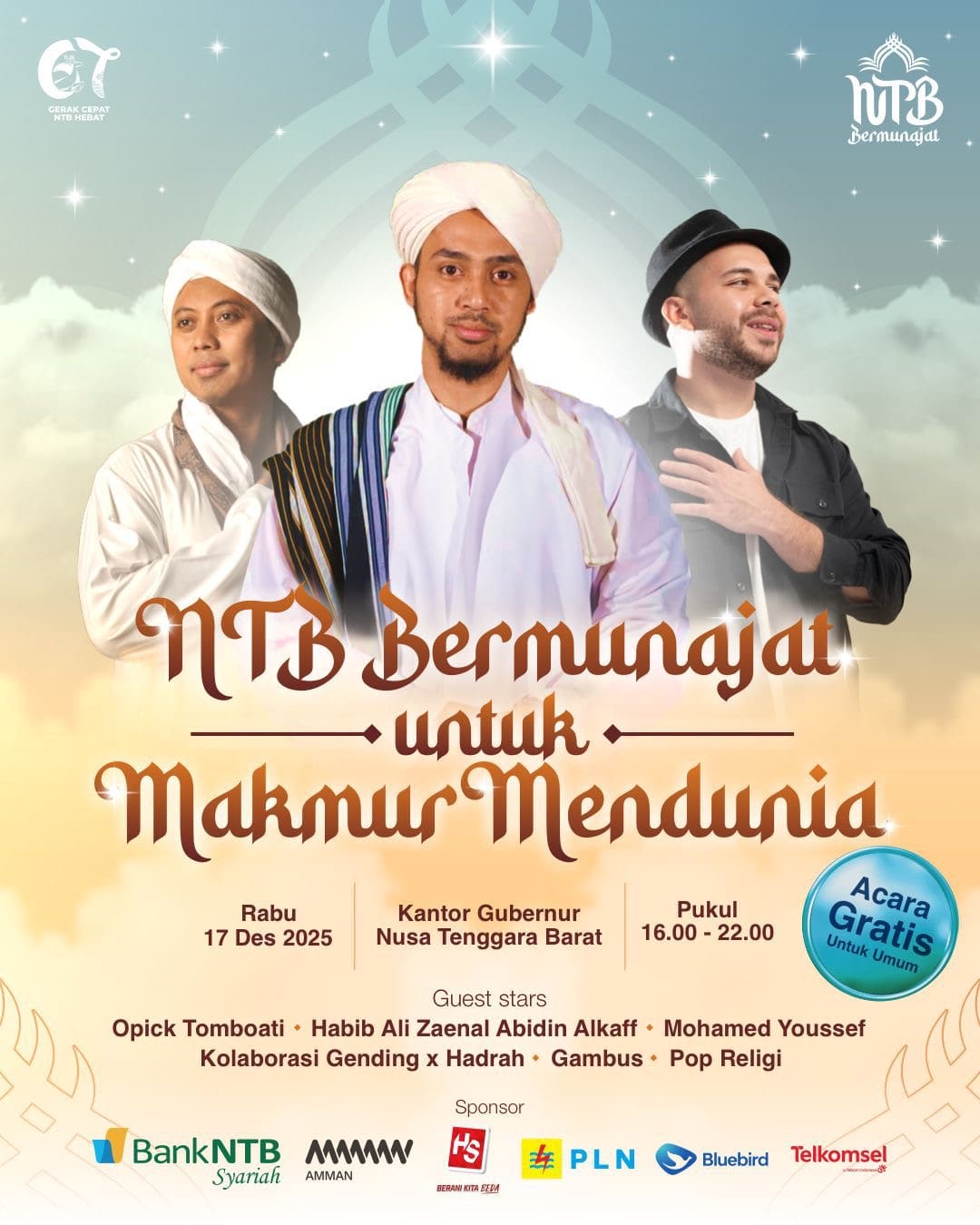Selain rangkaian doa dan munajat, acara ini juga akan dimeriahkan oleh sejumlah pengisi acara nasional, di antaranya Opick Tomboati, Habib Ali Zaenal Abidin Alkaf, dan Mohamed Youssef. Acara turut menampilkan kolaborasi seni religi dan budaya, seperti Gending x Hadrah, Gambus, serta Pop Religi, yang mencerminkan kekayaan tradisi dan kearifan lokal NTB.