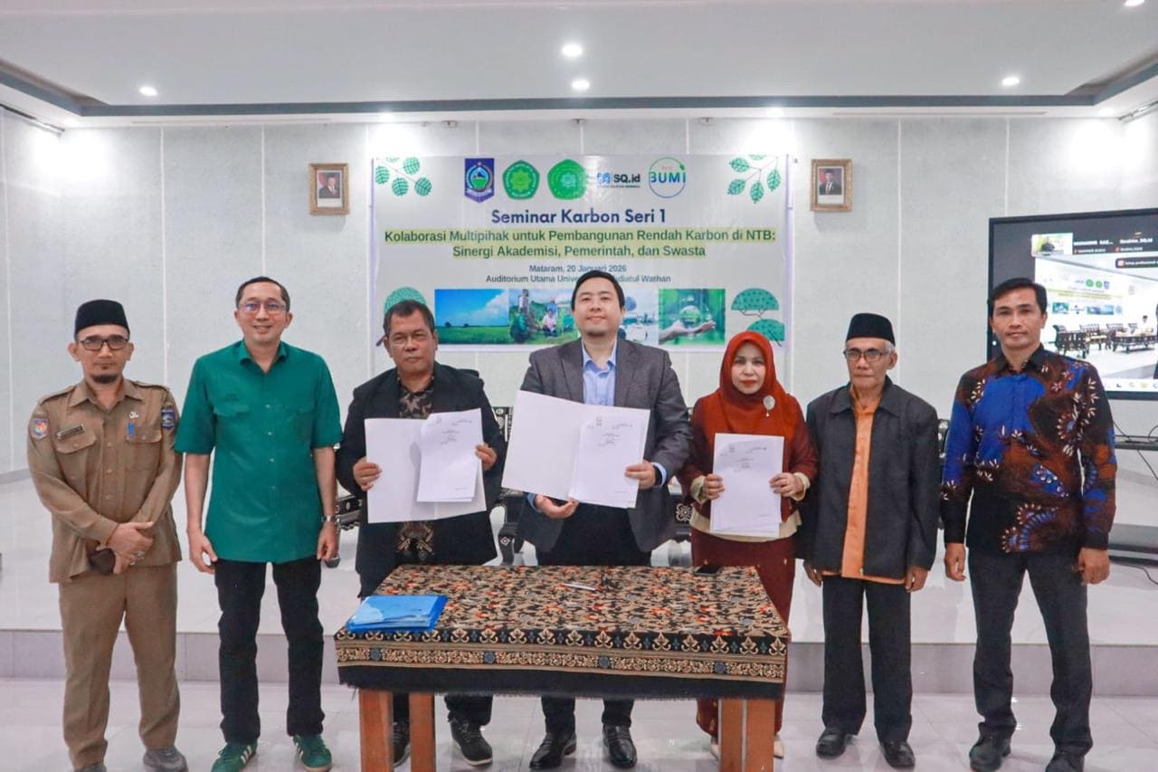 Pojok NTB — Universitas Nahdlatul Wathan (UNW) bersama Koperasi Senarai Quantum Indonesia (SQ.id) dan Heal BUMI resmi berkolaborasi untuk mendorong pembangunan rendah karbon serta mempercepat transisi menuju net zero di Provinsi Nusa Tenggara Barat (NTB). Kolaborasi ini ditandai dengan penyelenggaraan Seminar Series bertajuk “Pembangunan Rendah Karbon dan Akselerasi Transisi Net Zero yang Adil dan Berkelanjutan di NTB” yang digelar secara hybrid di Auditorium UNW, Selasa (20/1).