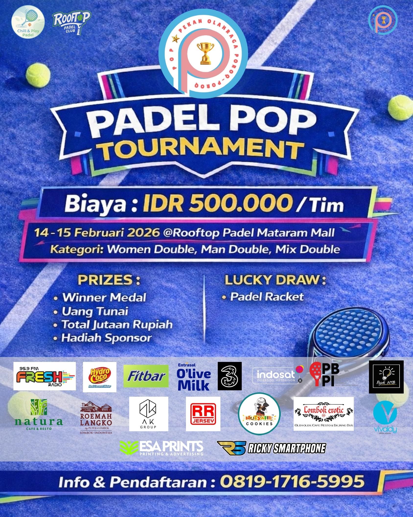 Pojok NTB — Semangat berolahraga dan atmosfer kompetisi akan menyatu dalam ajang Padel POP, yang digelar pada 14–15 Februari 2026 di Rooftop Padel, Mataram Mall. Kegiatan ini menjadi bagian dari POP (Pekan Olahraga Poroq-Poroq), sebuah inisiatif yang membuka ruang seluas-luasnya bagi masyarakat untuk merasakan sensasi bertanding layaknya atlet profesional.
