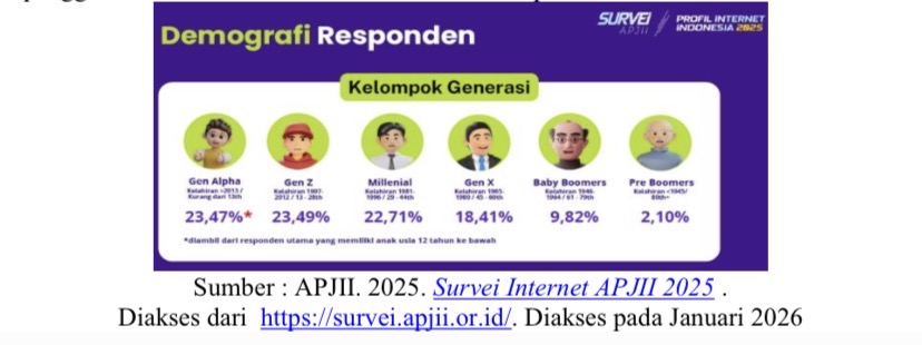 Perkembangan media digital atau internet saat ini begitu cepat dan massif. Akses kepemilikan dan penggunaan media semakin murah, semakin mudah didapatkan dan digunakan (user friendly) oleh berbagai elemen masyarakat, termasuk kelompok anak. Terjadinya pandemi Covid yang puncaknya terjadi di Indonesia antara tahun 2020-2022, mendorong peningkatan penggunakan media digital atau internet yang luar biasa di Indonesia. Ini terlihat dari peningkatan akses anak pada media digital. Survei Penetrasi Internet Dan Perilaku Penggunaan Internet 2025 yang dilakukan oleh APJII (Asosiasi Penyelenggara Jasa Internet Indonesia), dalam situsnya (https://survei.apjii.or.id/) menunjukkan bahwa anak Indonesia yang merupakan bagian dari generasi atau Gen Z dan Gen Alpha menjadi pengguna internet yang aktif. Bahkan dengan usia mereka yang masih di bawah 18 tahun, jumlah penggunanya semakin meningkat dari tahun ke tahun. Data menunjukkan bahwa jumlah mereka telah mencapai 46,96 persen (Gen Alpha sejumlah 23,47% dan Gen Z sejumlah 23, 49%) dari total pengguna internet di Indonesia. Data tersebut dapat dilihat dari tabel berikut ini :