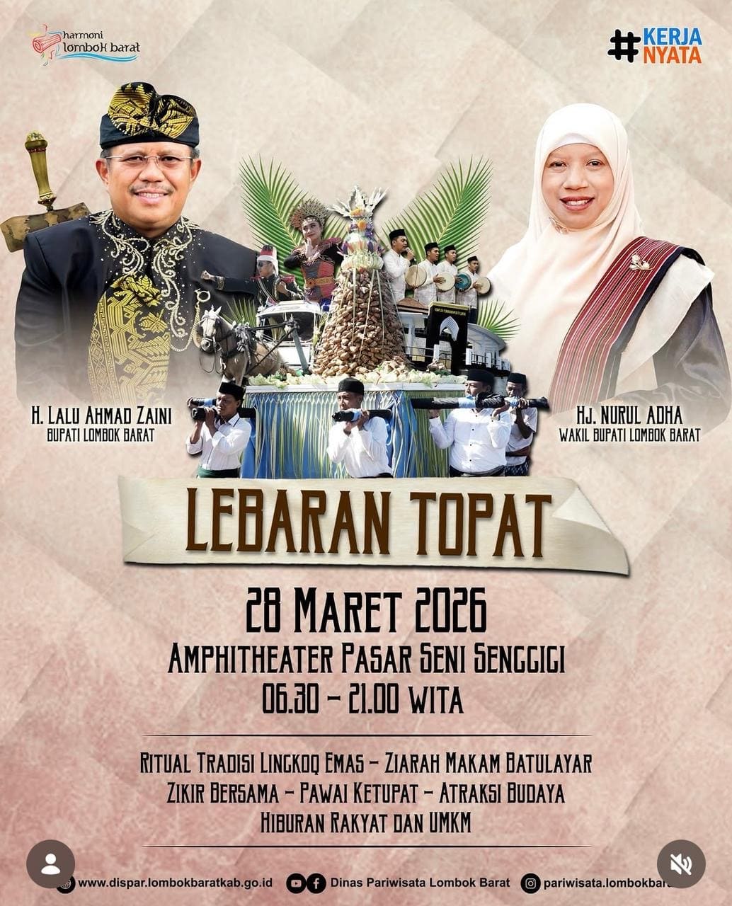 Bupati Lombok Barat H. Lalu Ahmad Zaini bersama Wakil Bupati Hj. Nurul Adha turut mengajak seluruh masyarakat untuk meramaikan dan melestarikan tradisi Lebaran Topat sebagai bagian dari identitas budaya daerah.
