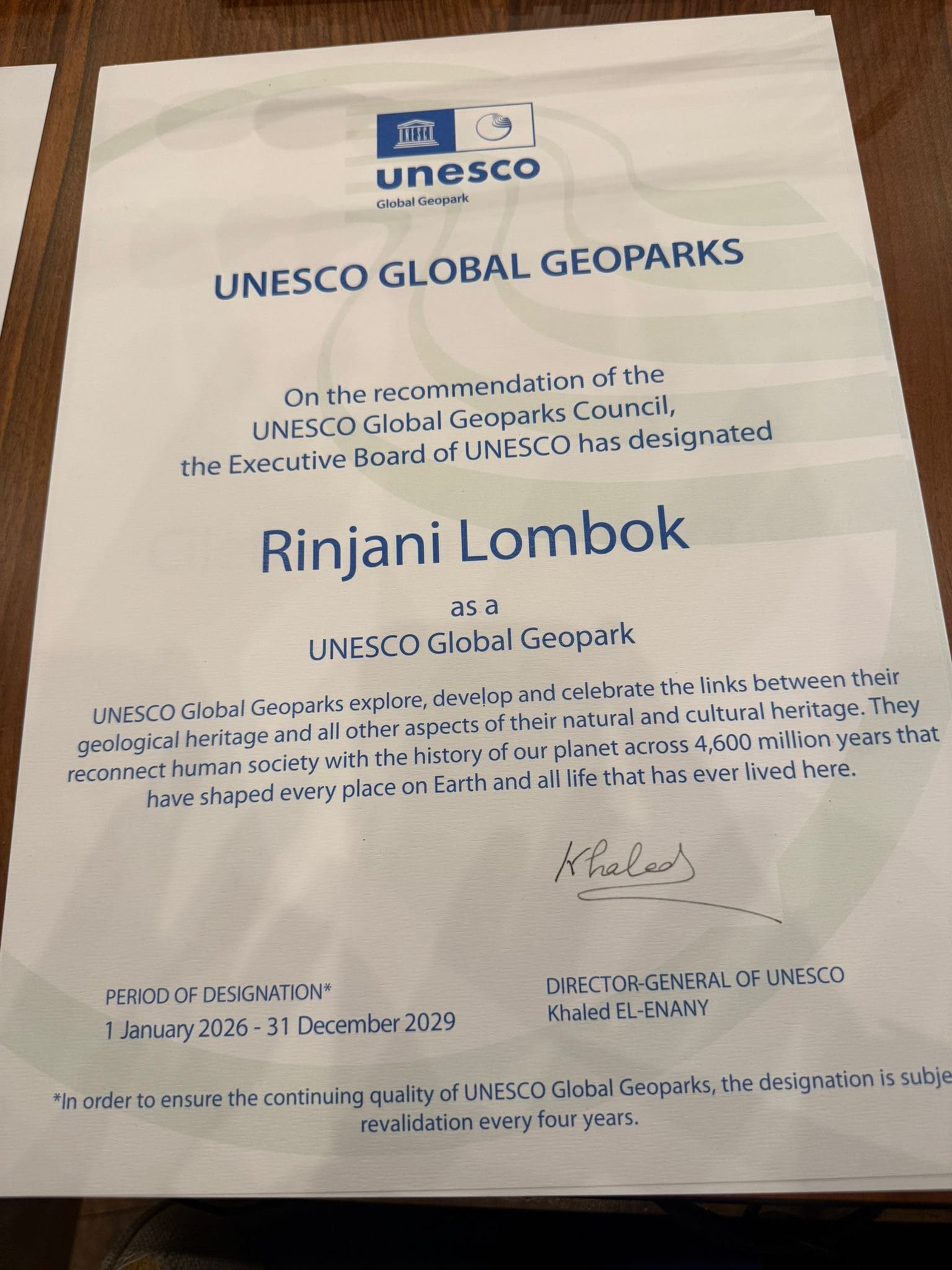 Pojok NTB – Gunung Gunung Rinjanj kembali menorehkan prestasi di tingkat dunia. Kawasan ini resmi mendapatkan kembali status sebagai UNESCO Global Geopark, yang ditandai dengan penerimaan sertifikat di Paris pada awal pekan ini.